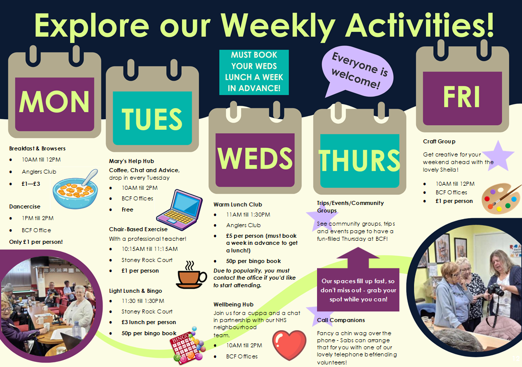 We deliver a broad programme of weekly activities, support, and services to enable people aged 55+ to live independently and safely in their own homes and to reduce poverty and isolation.